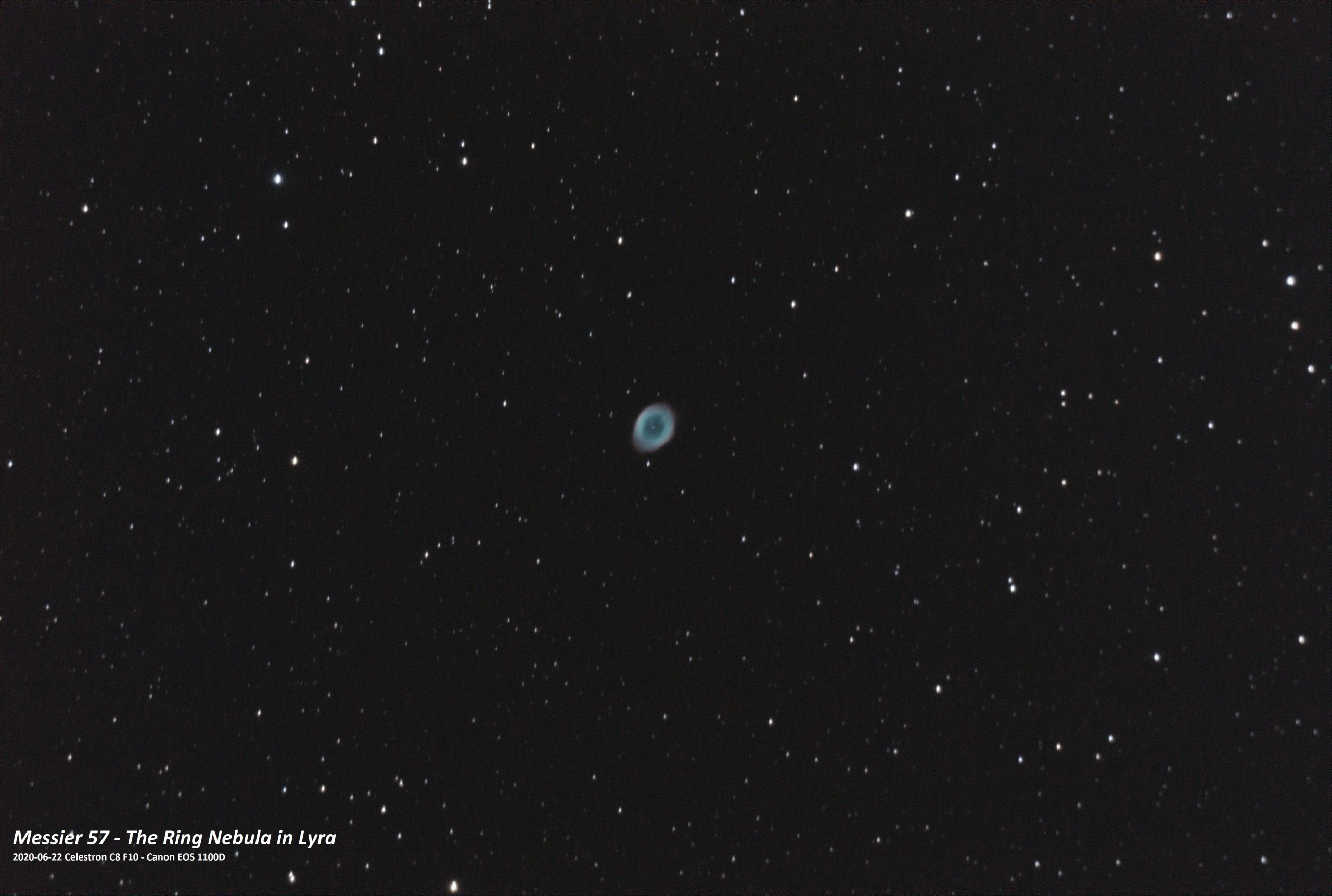 M57, or the Ring Nebula, is a planetary nebula, the glowing remains of a sun-like star. The tiny white dot in the center of the nebula is the star’s hot core, called a white dwarf. M57 is about 2,000 light-years away in the constellation Lyra, and is best observed during August. Discovered by the French astronomer Antoine Darquier de Pellepoix in 1779, the Ring Nebula has an apparent magnitude of 8.8 and can be spotted with moderately sized telescopes.